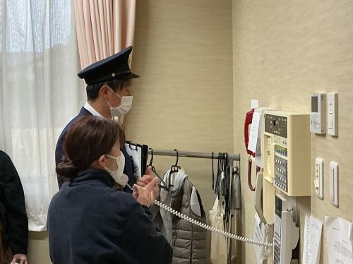 緊急通報装置や通常の電話を使用しての訓練を交代で体験しました