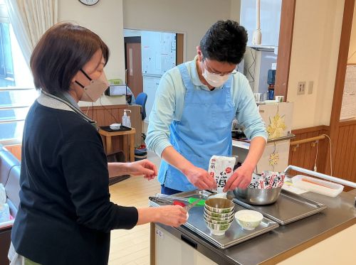 非常時に備蓄してあるお粥を実際に調理して利用者に提供しました。